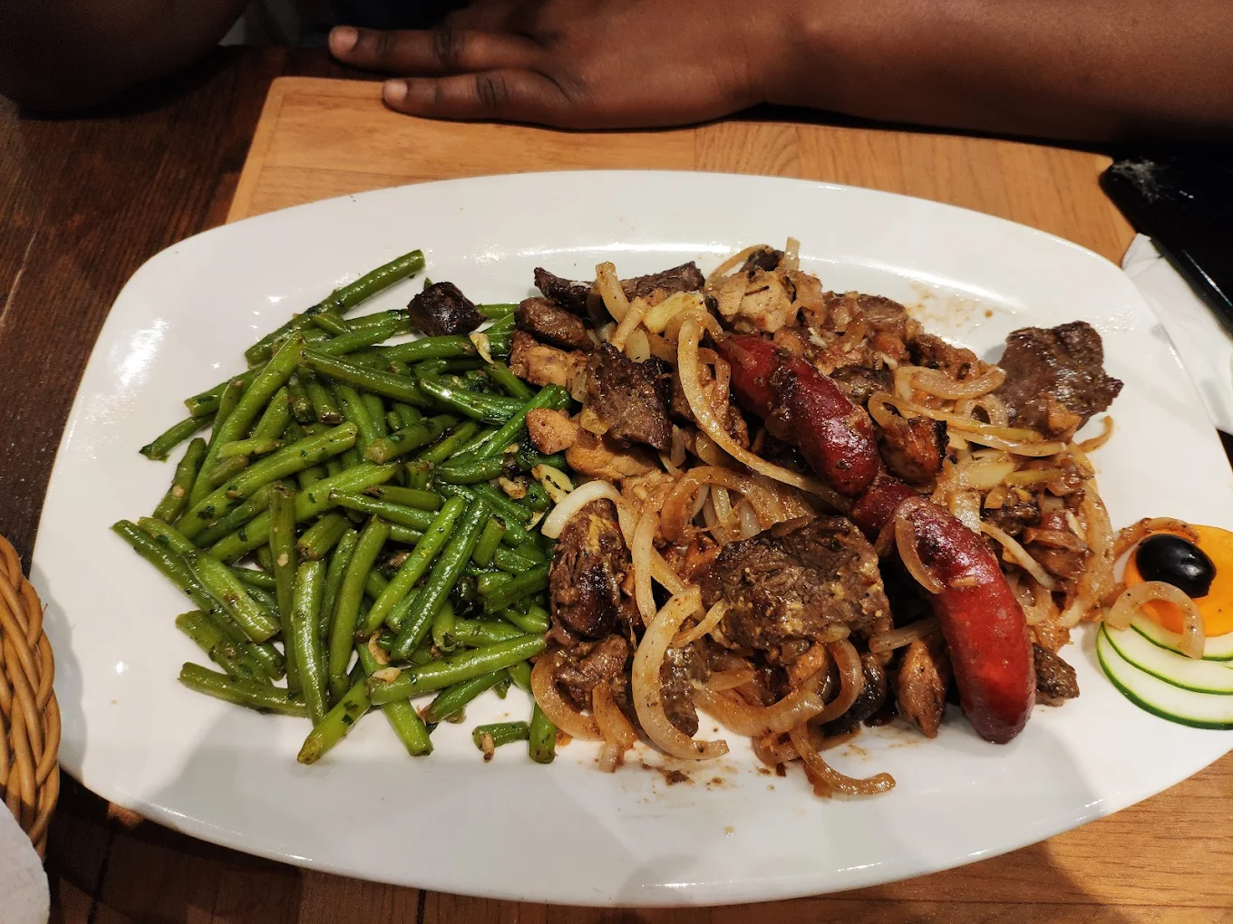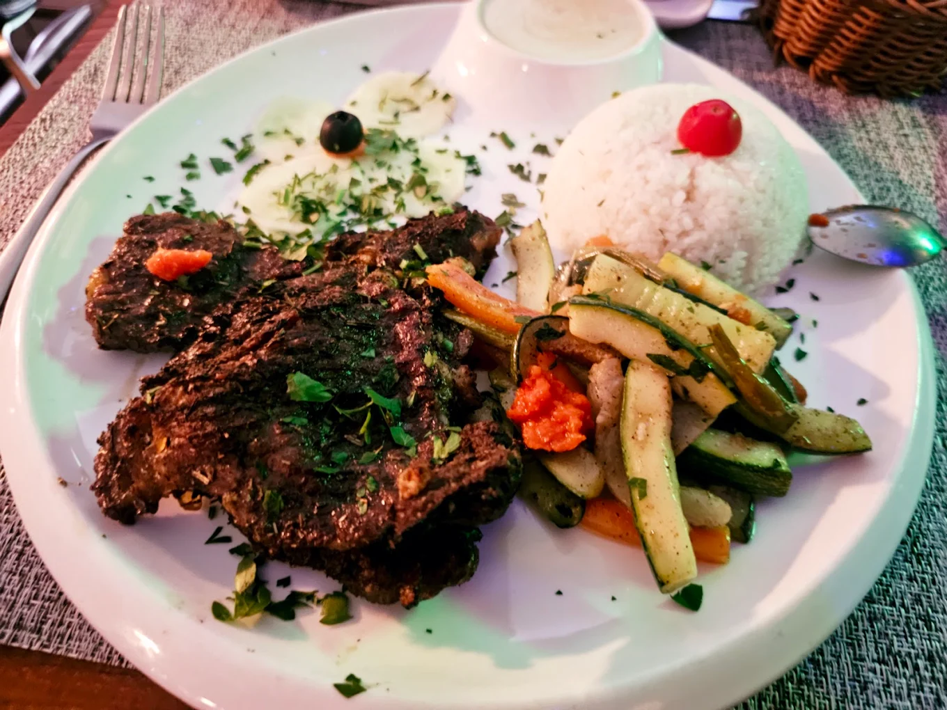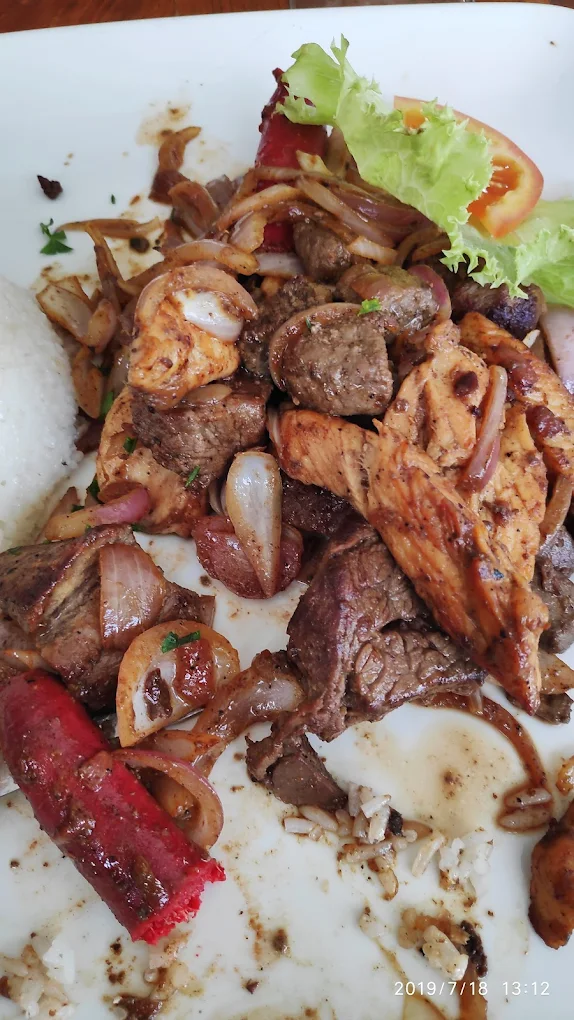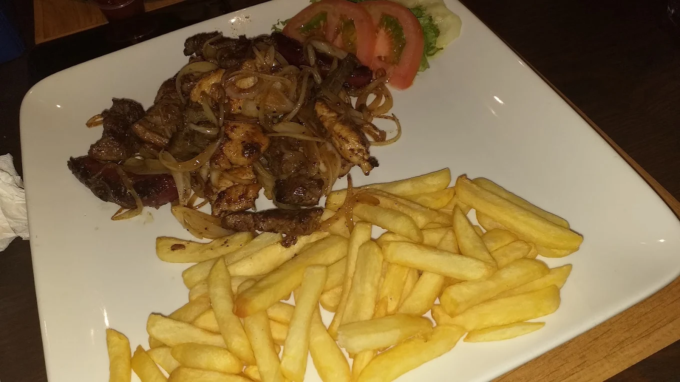 Plongez dans notre création unique, un mélange généreux de bœuf et de poulet marinés, parfaitement saisis pour une tendreté et une saveur incomparables. Ce plat riche et savoureux est rehaussé d'oignons rouges caramélisés, de délicieuses saucisses grillées.